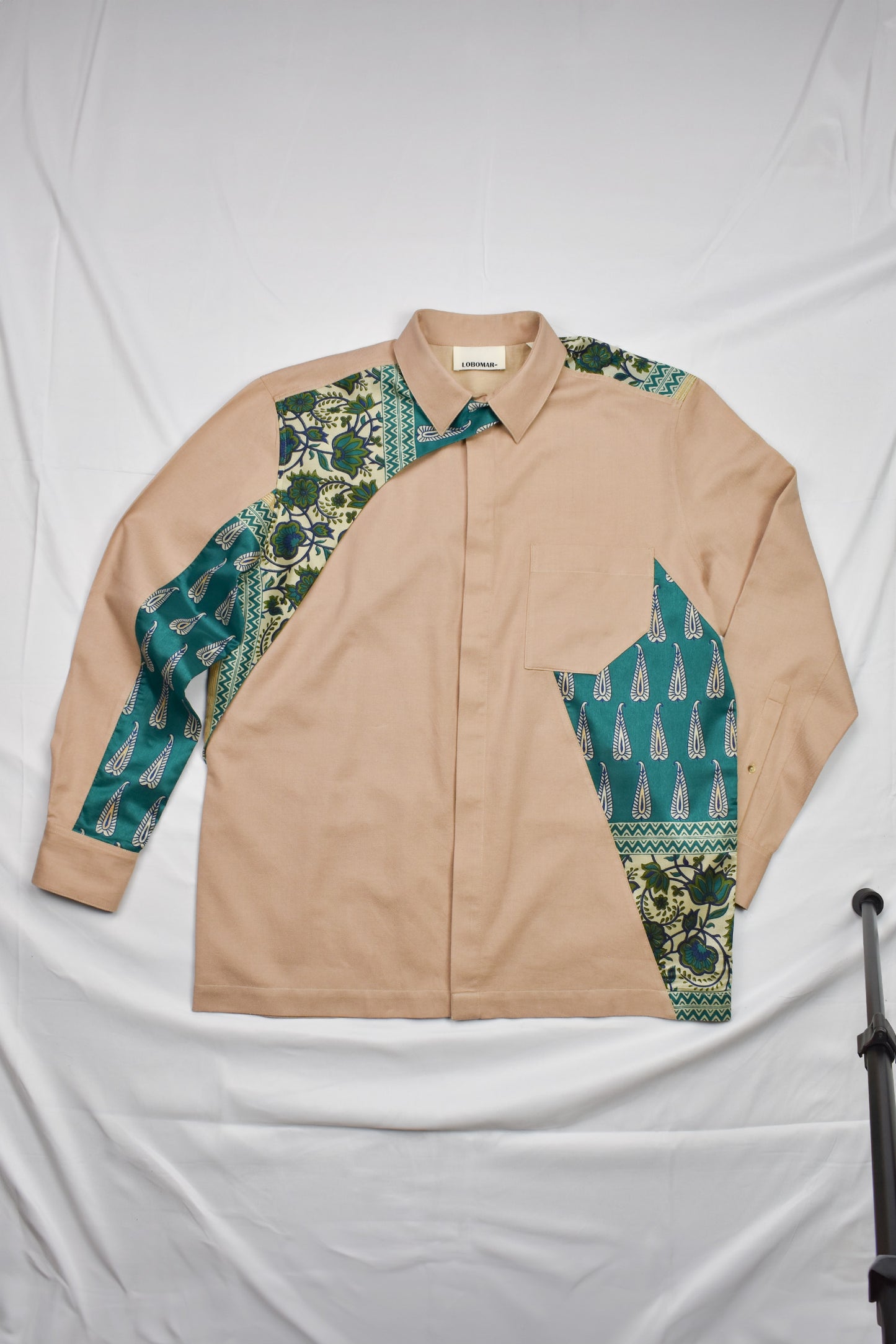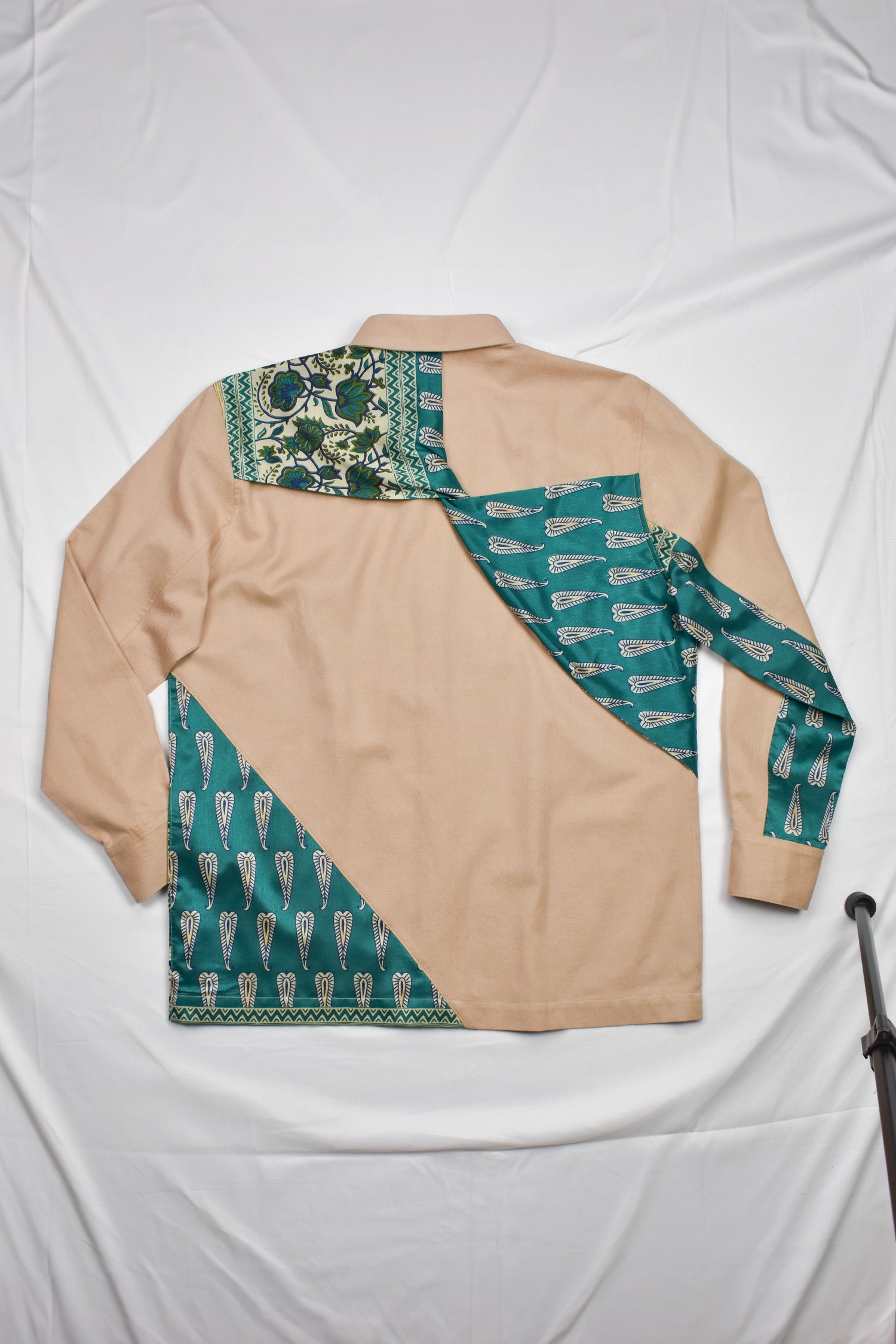 A classic button-down shirt with a Saree-twist. The silk Saree carries a Paisley and Jacobean pattern on a Turquoise base.