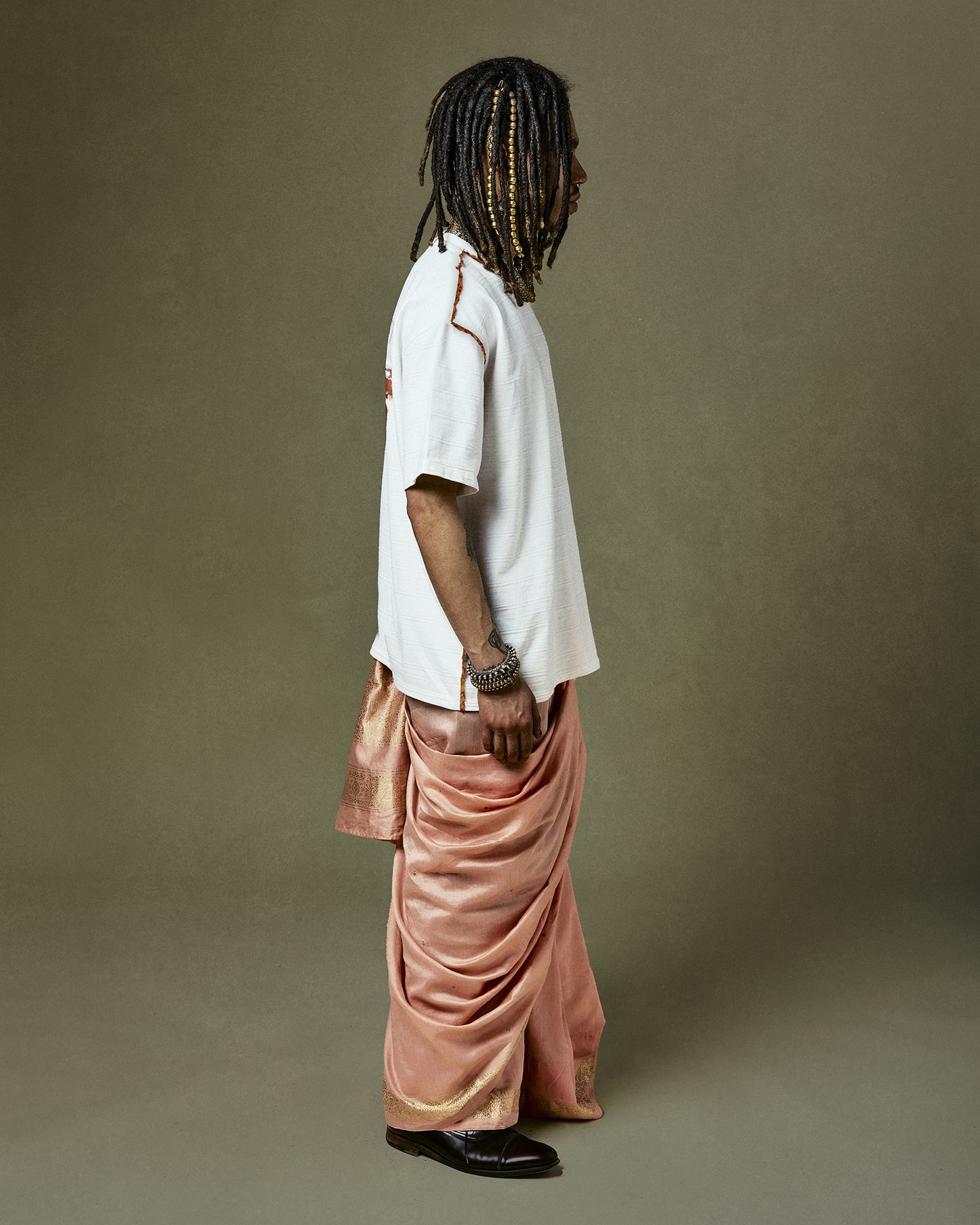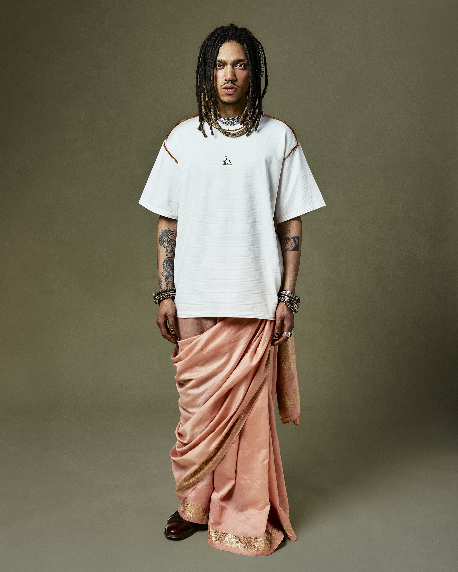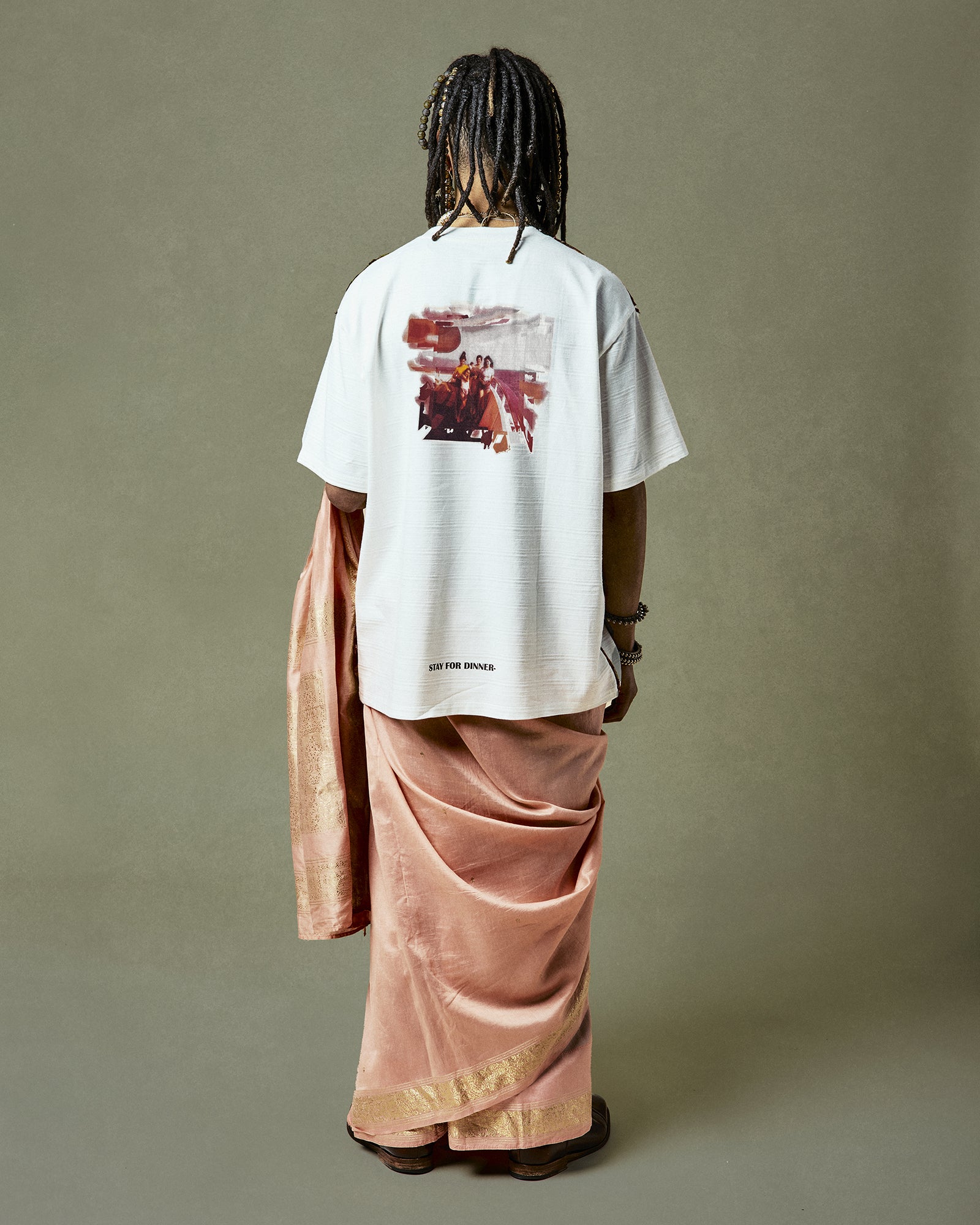 The Quinto T-Shirt is a nod to reimagined traditions. Adorned with silk Saris sourced from Marcella and Marco's Aunt and Ladies from her neighborhood in Mumbai.