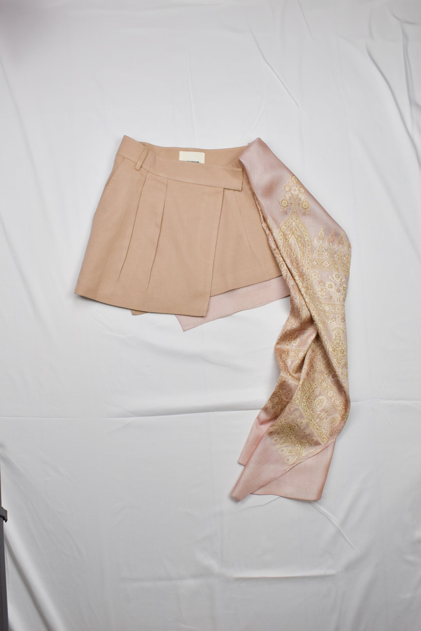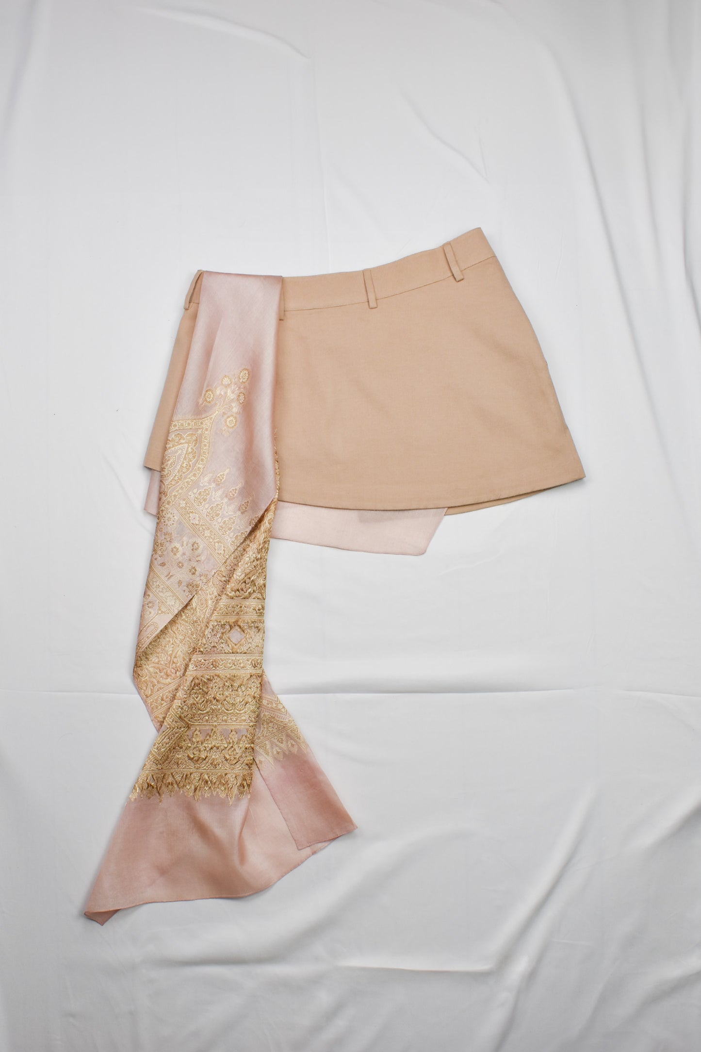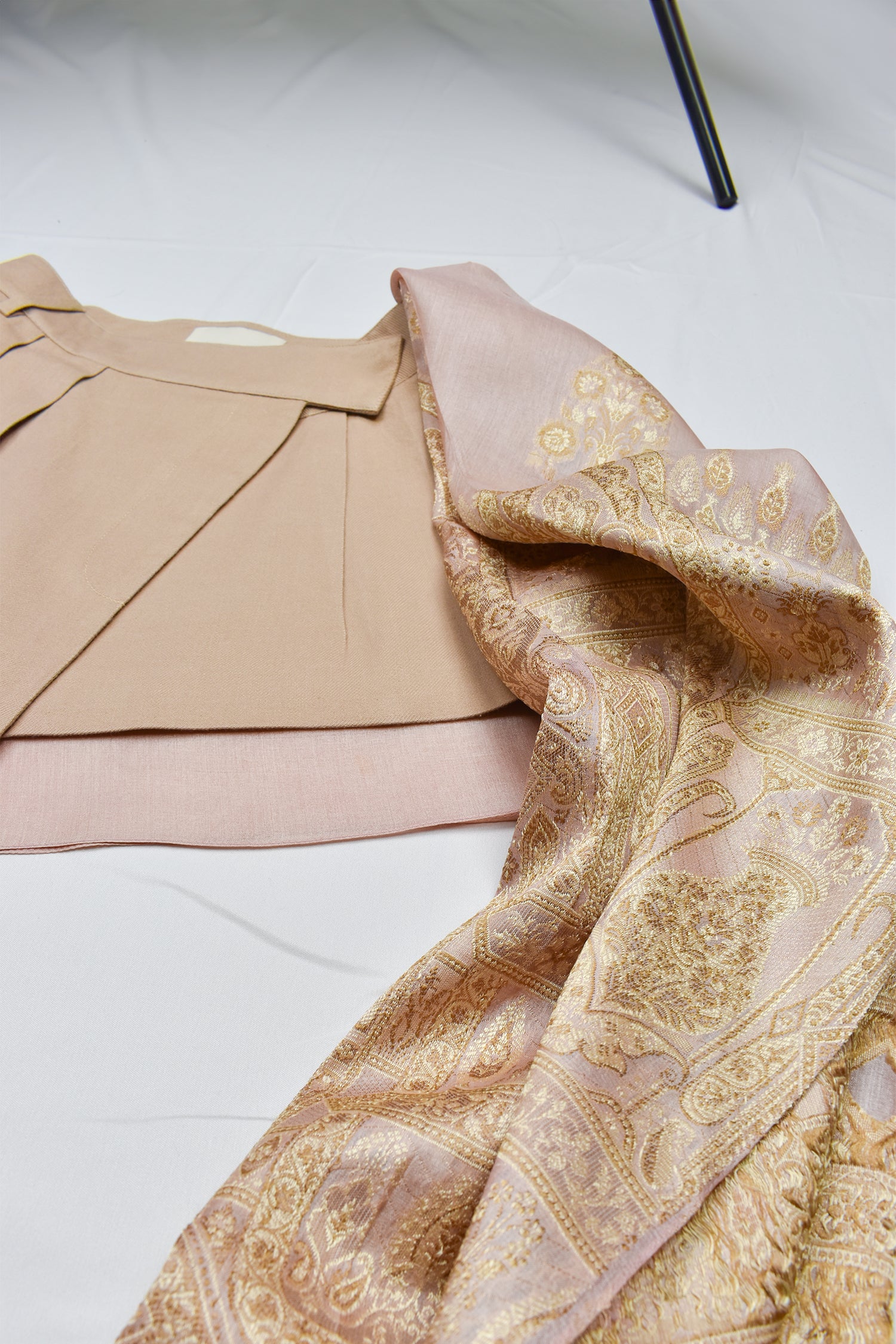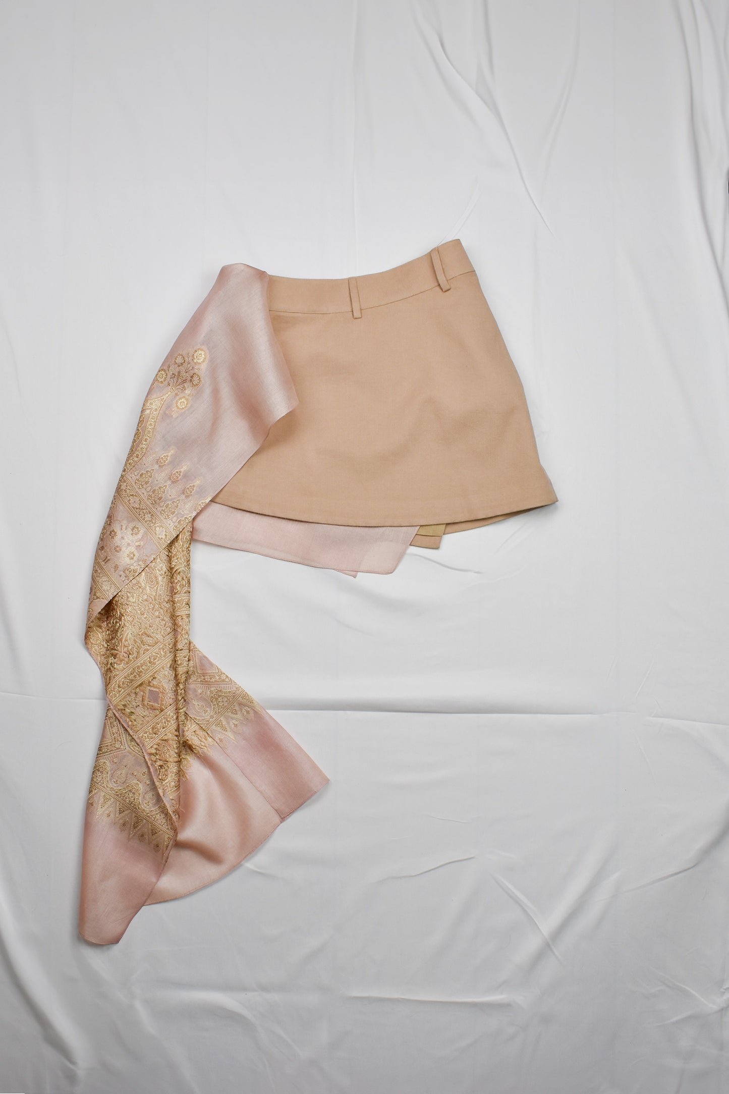 A pleated wrap mini skirt with a free-flowing ankle-length Saree drape. The Silk Saree displays a Damask pattern weave of light gold threads against a powdery rose base.