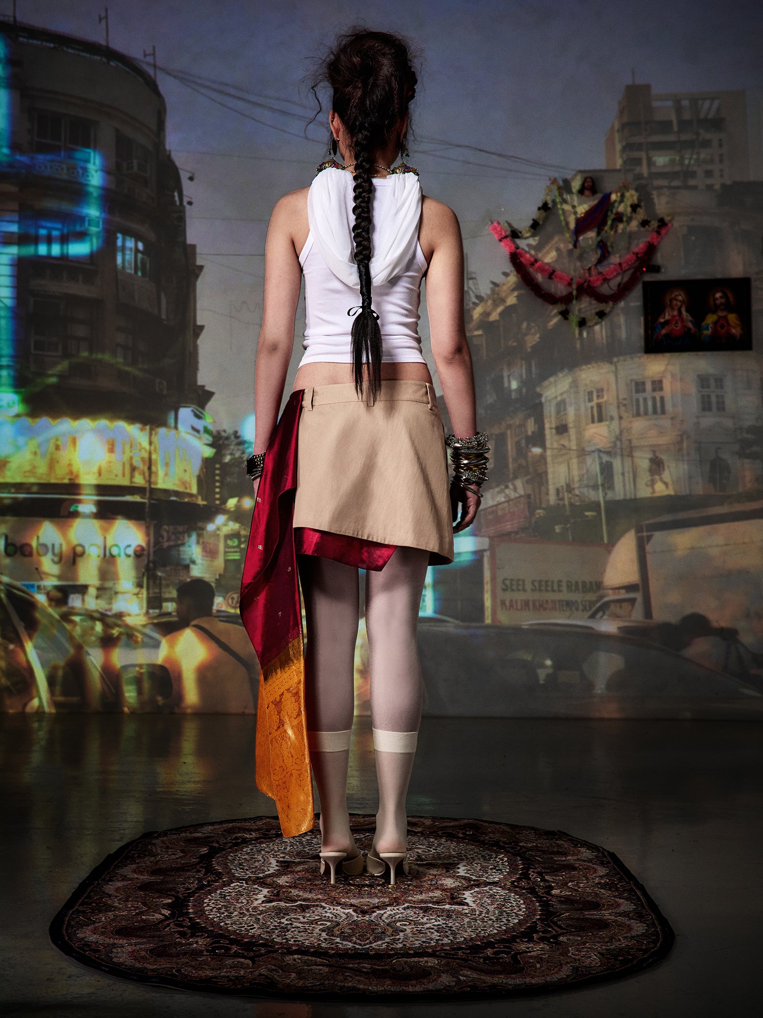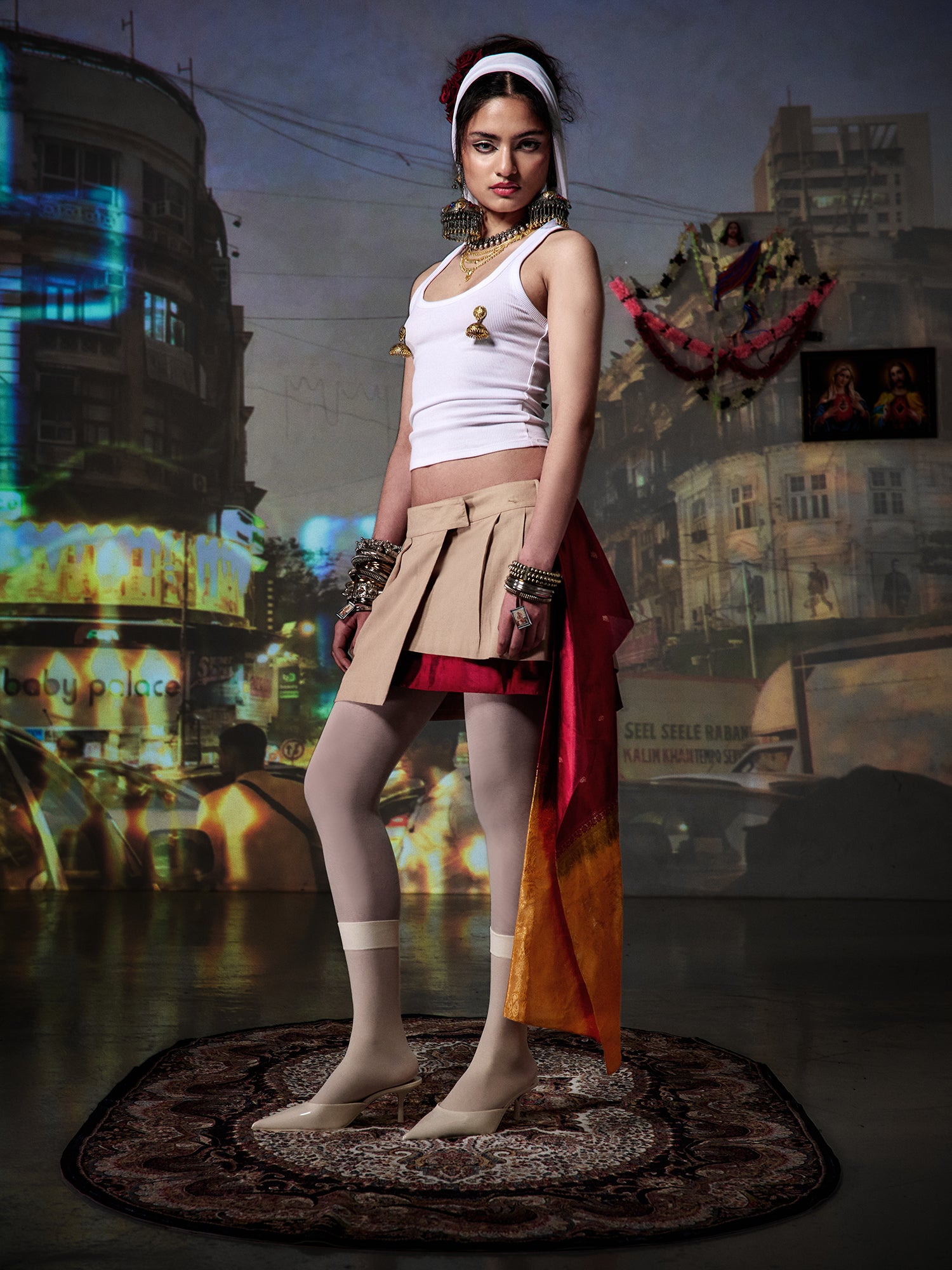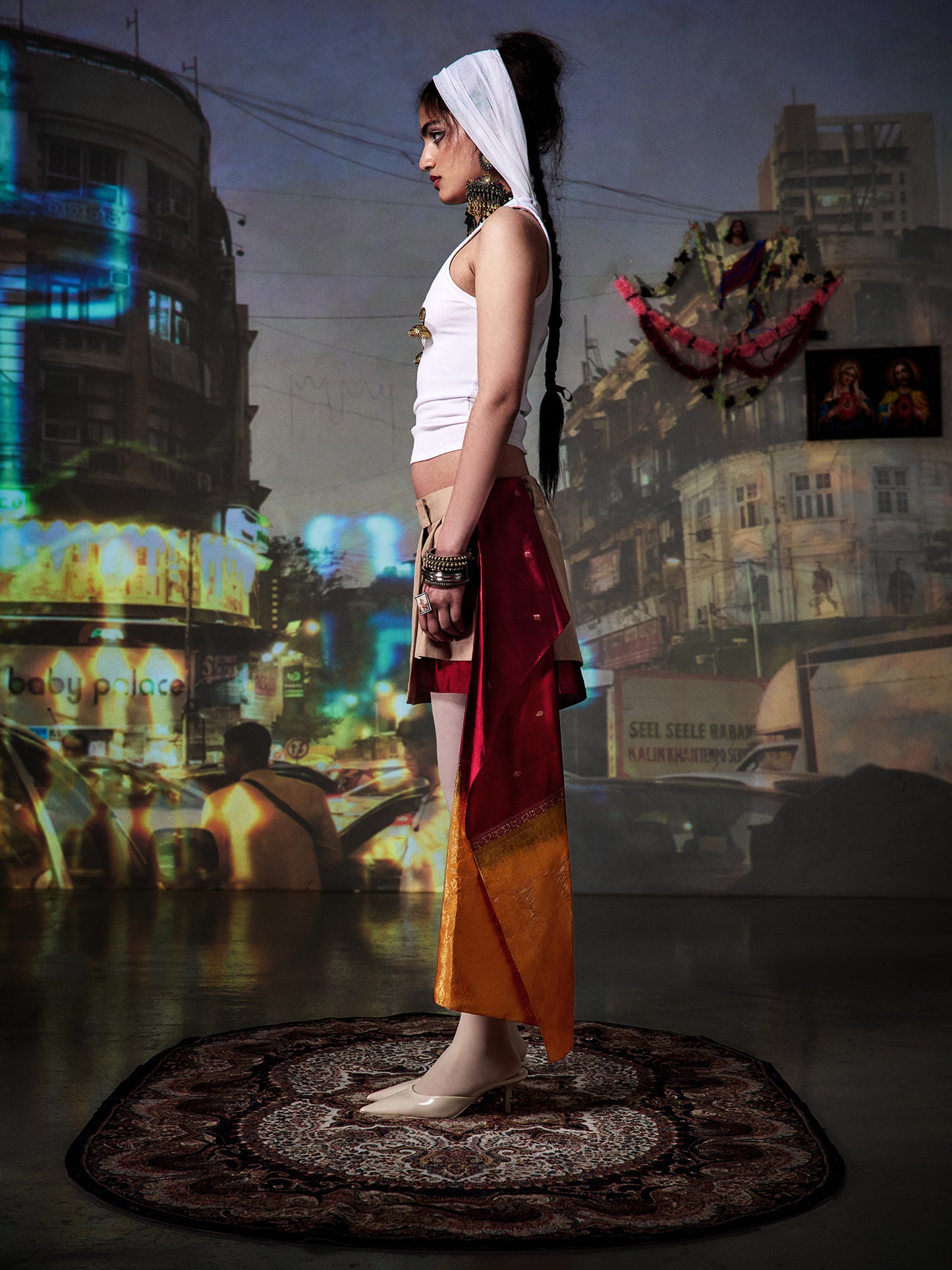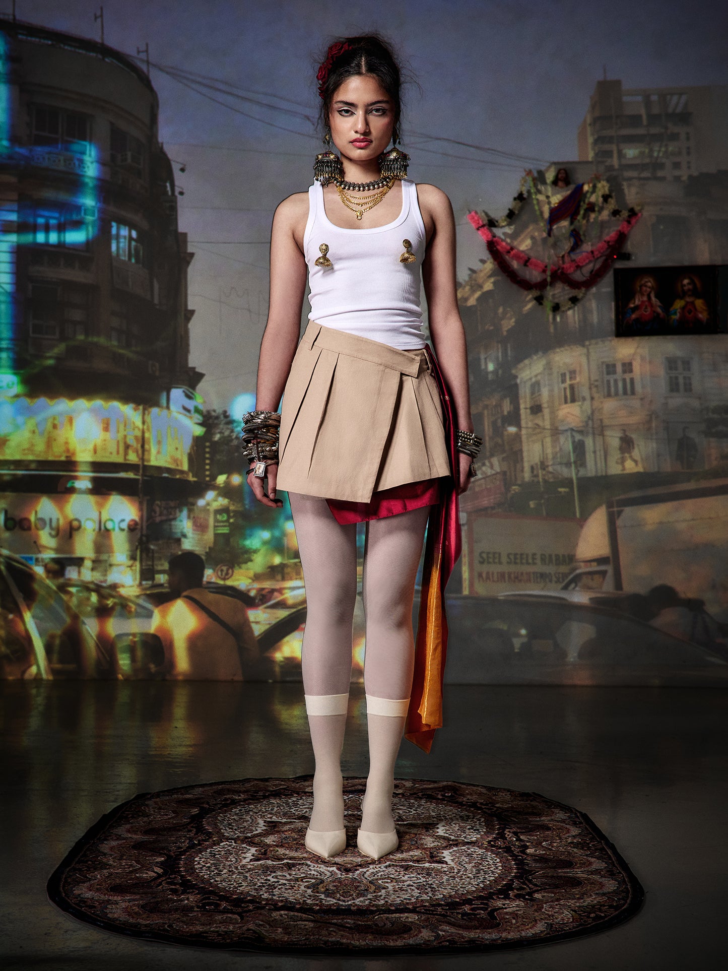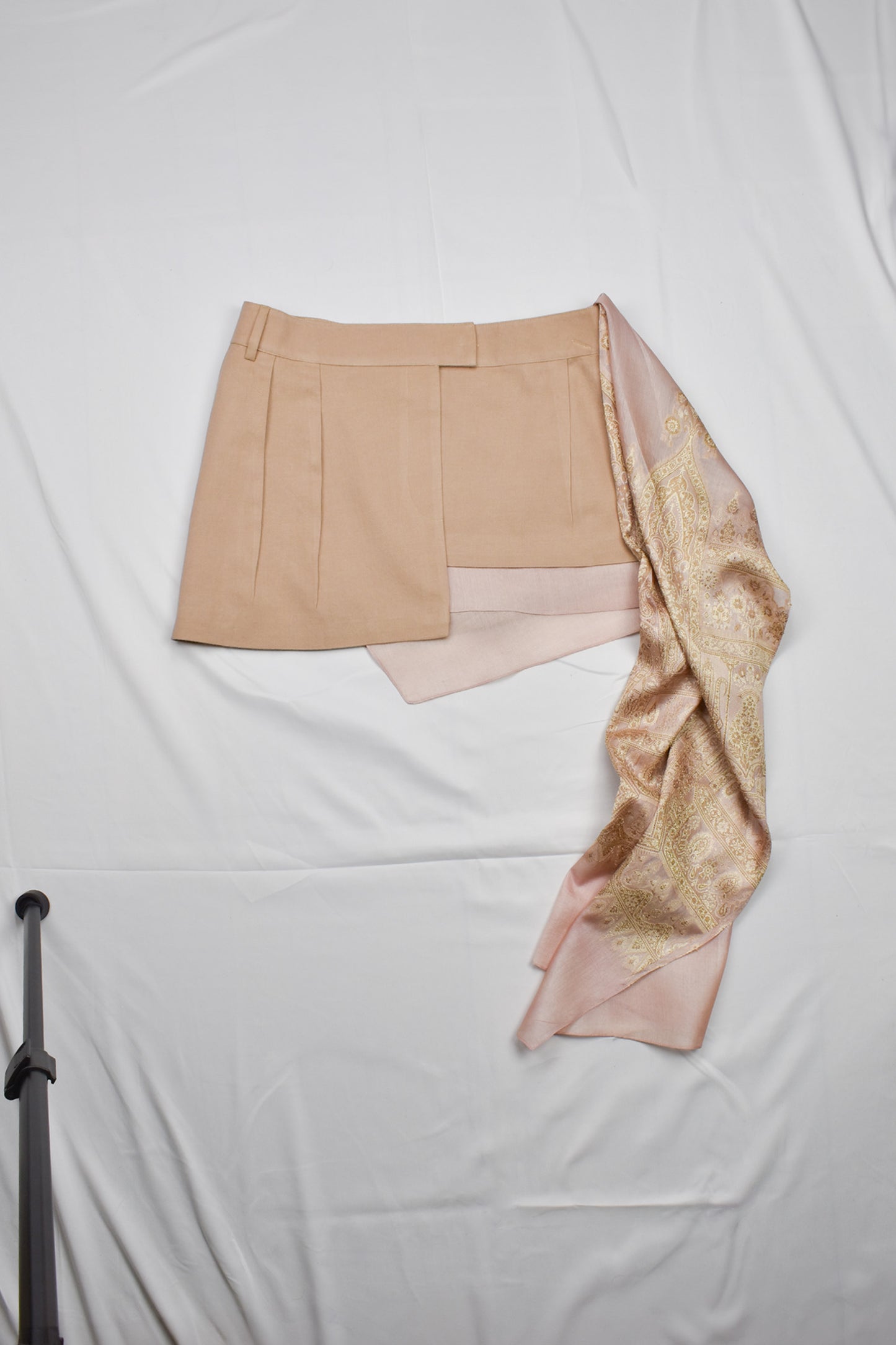 A pleated wrap mini skirt with a free-flowing ankle-length Saree drape. The Silk Saree displays a Damask pattern weave of light gold threads against a powdery rose base.